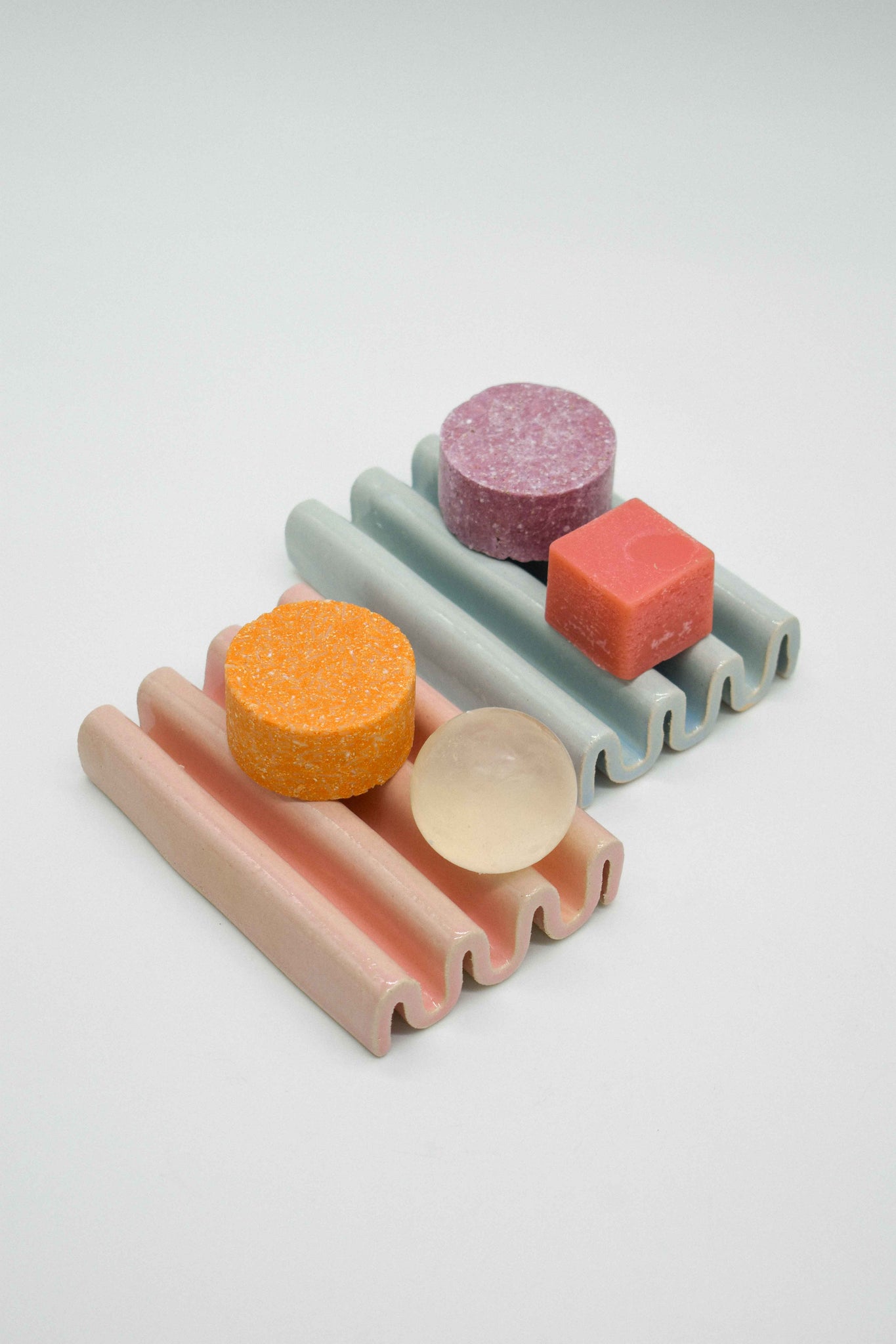 Ambos proyectos creativos se unen para crear esta colaboración de forma, color y texturas. Cada jabonera o plato de cerámica gres es una pieza única, hecha a mano por Sofía Acuña en su taller en Santiago.