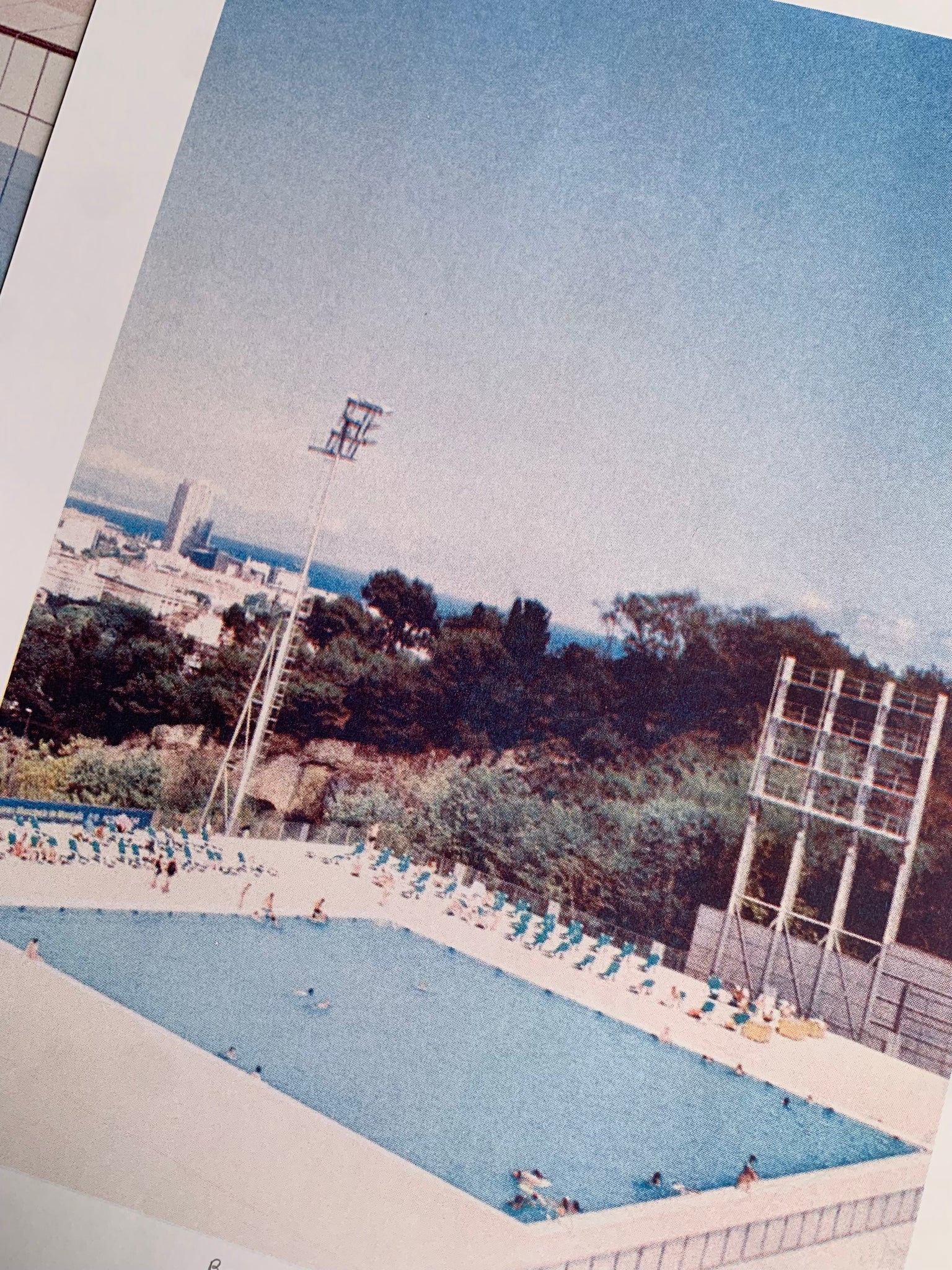 Foto mirando hacia el horizonte de la ciudad y el Mar Mediterráneo, desde la increíble Piscina Olímpica del Montjuic, Barcelona, inaugurada en 1929.