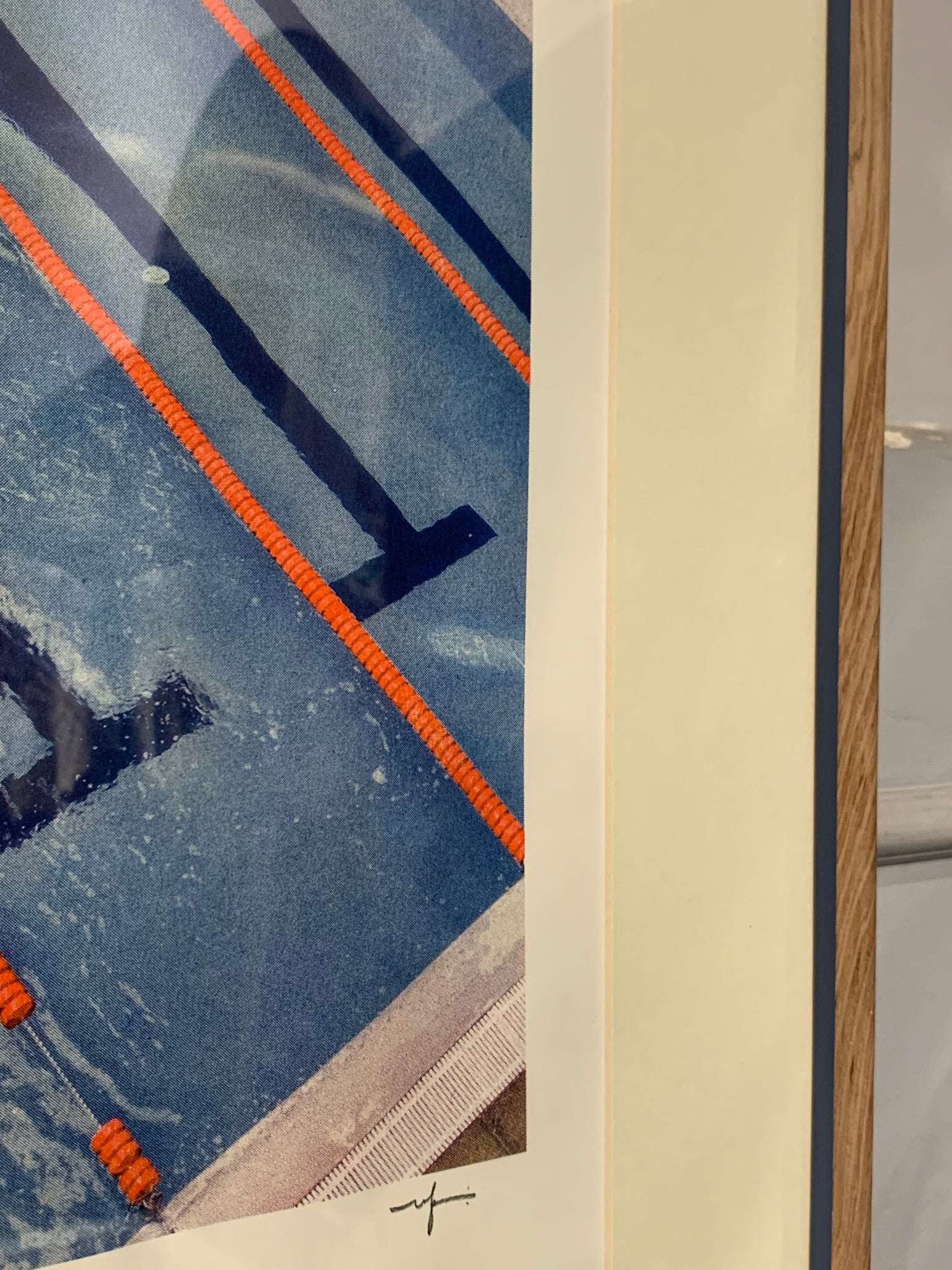 Enmarcada en madera de mañío, con canto interior pintado azul a mano, y paspartú blanco hueso, por Taller Piña en Santiago de Chile.