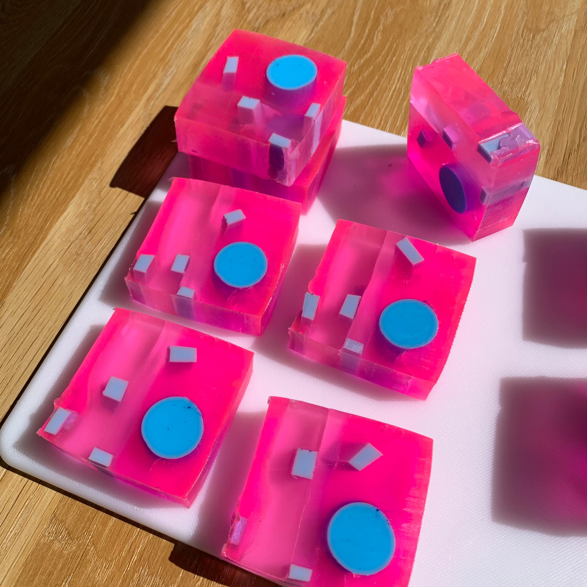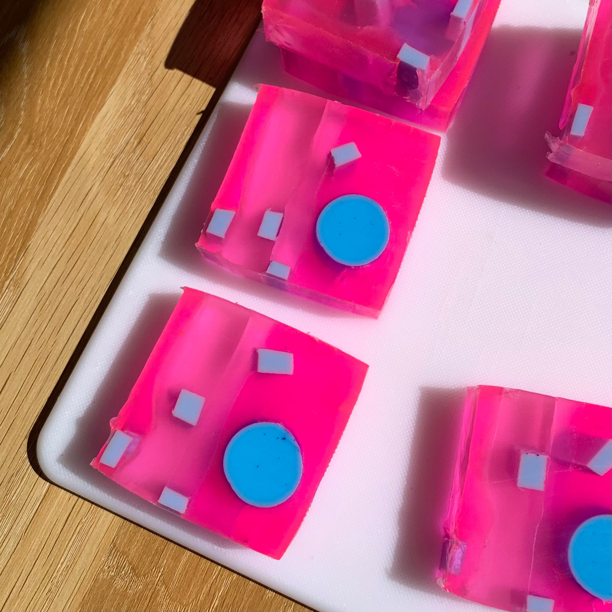 Hecho en base a jabón de glicerina y jabón blanco. El jabón de glicerina es un jabón de pH neutro, esto lo hace ser muy amable con todo tipo de piel, apto incluso para las más sensibles. El jabón de glicerina es suave y emoliente, esto quiere decir que relaja una impureza o inflamación. Este jabón contiene tintes minerales y colorantes líquidos vegetales, hidrosolubles e hipoalergénicos.
